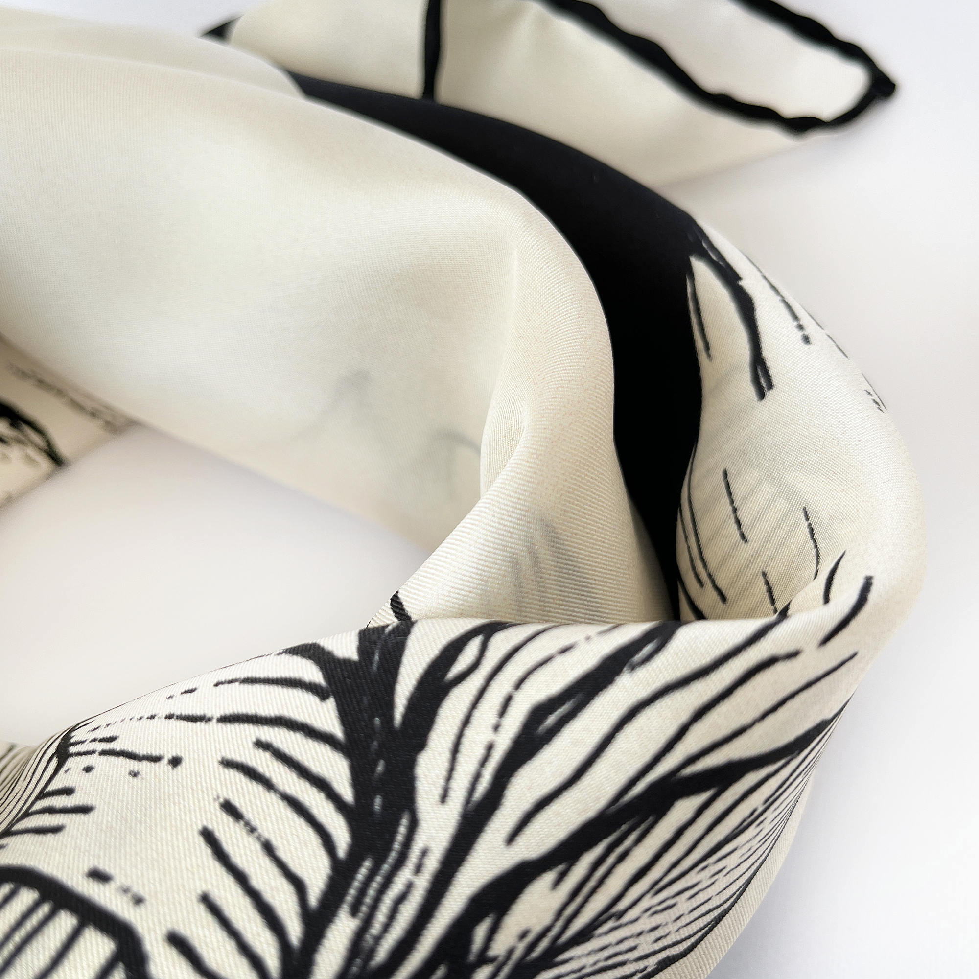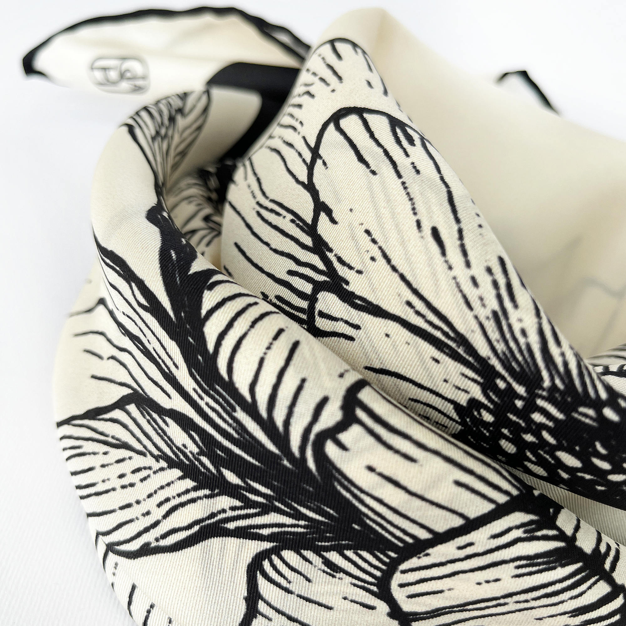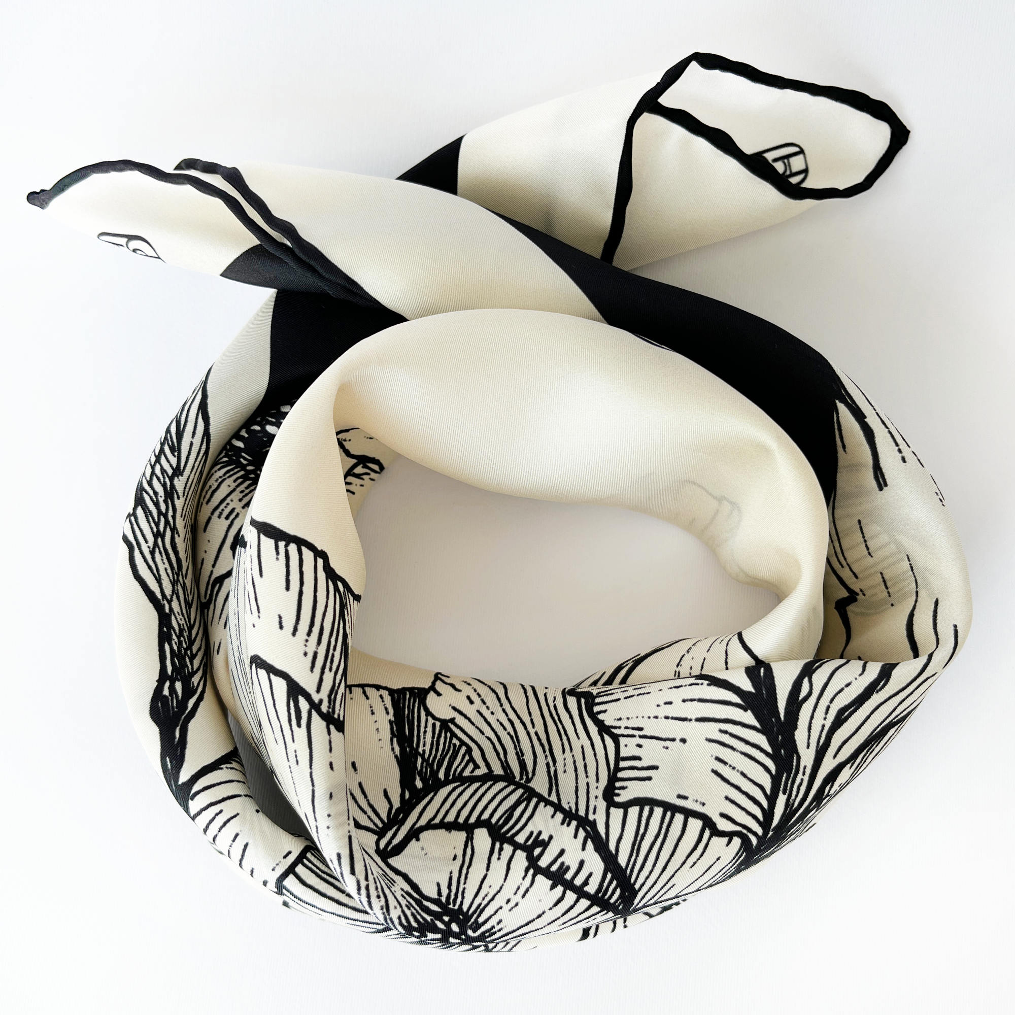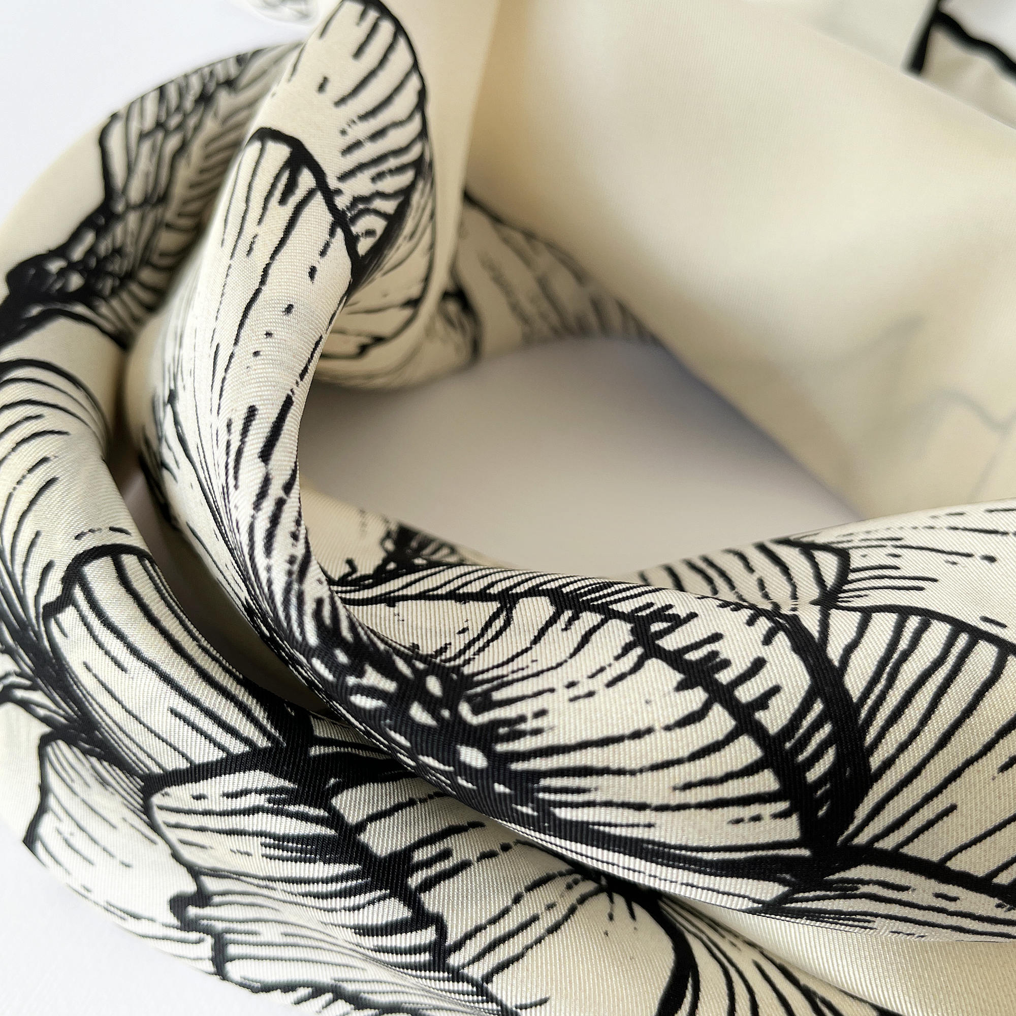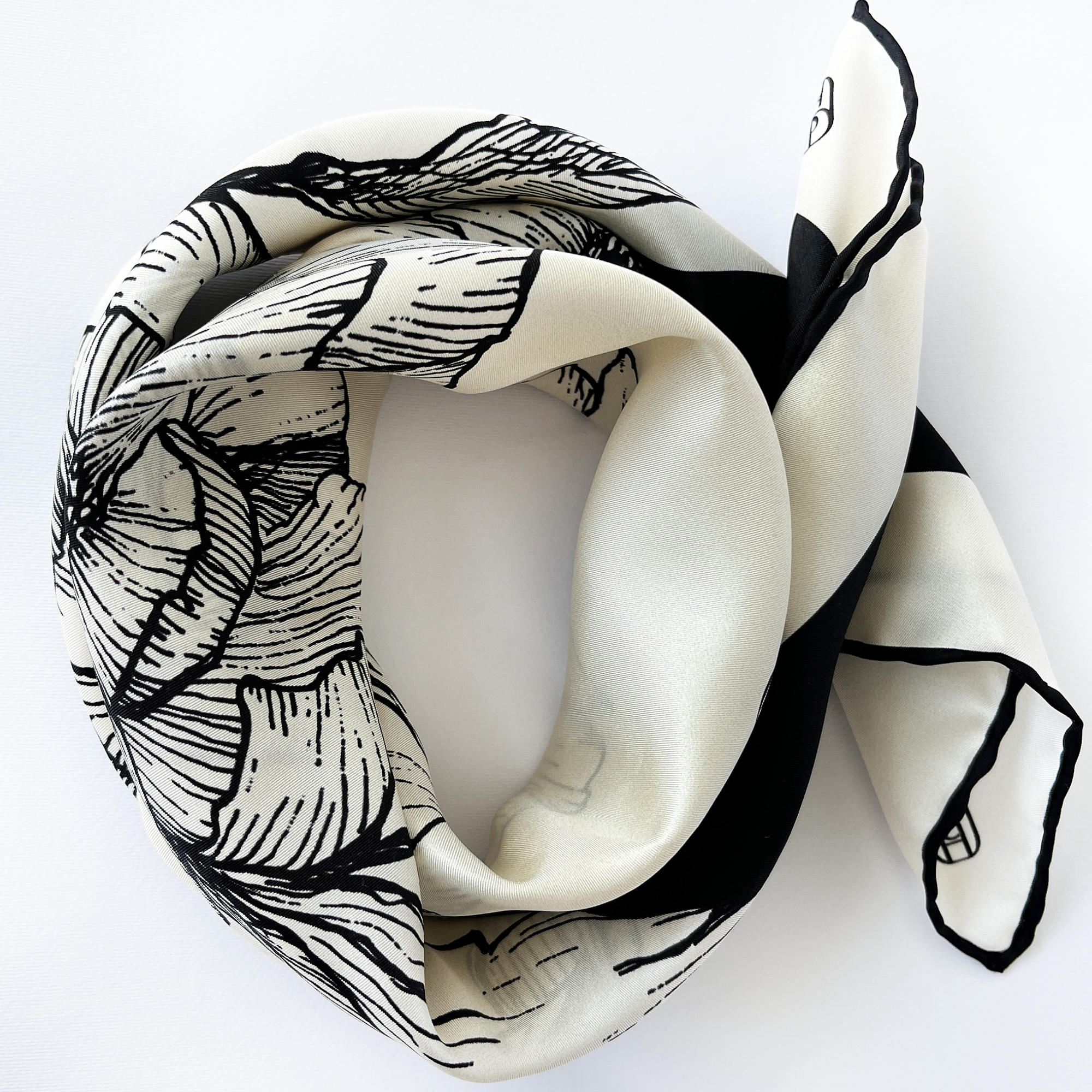 Store the scarf untied. If needed, iron at a low temperature to remove wrinkles; avoid ironing the hand-rolled edges to preserve their shape.